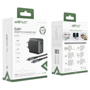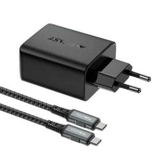 Acefast 2-in-1 fast charger. It has a USB Type C port that allows charging with a maximum power of 65W and a USB 5W port. The UBS Type C plug can be used to power notebooks that require up to 65W of power to work (check the specification of your computer). It allows you to quickly charge two devices at the same time, incl. in PPS, Power Delivery, Quick Charge 3.0, AFC and FCP standards. It is made of fireproof PC material. It has been equipped with many protections, such as overheating, overvoltage, high voltage or overload. The set includes a USB Type C – USB Type C cable with a length of 1.8m. The electronic components of the charger are made in GaN technology, i.e. they are based on gallium nitride, not on silicon. GaN means better work efficiency and lower energy consumption.