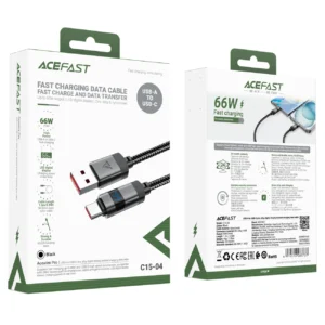 Acefast C15-04 USB-A – USB-C cable provides fast and efficient charging with a power of up to 66W and data transfer at a speed of 480Mb/s. Equipped with a digital LED display, it informs about the actual charging power in real time. Solid braided construction guarantees durability and resistance to bending and damage. CE, RoHS, FCC and EAC certificates confirm the safety of use.
