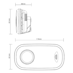 - Matmenys 119 mm (plotis) x 62 mm (aukštis) x 38 mm (gylis)