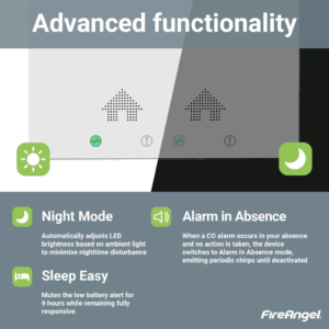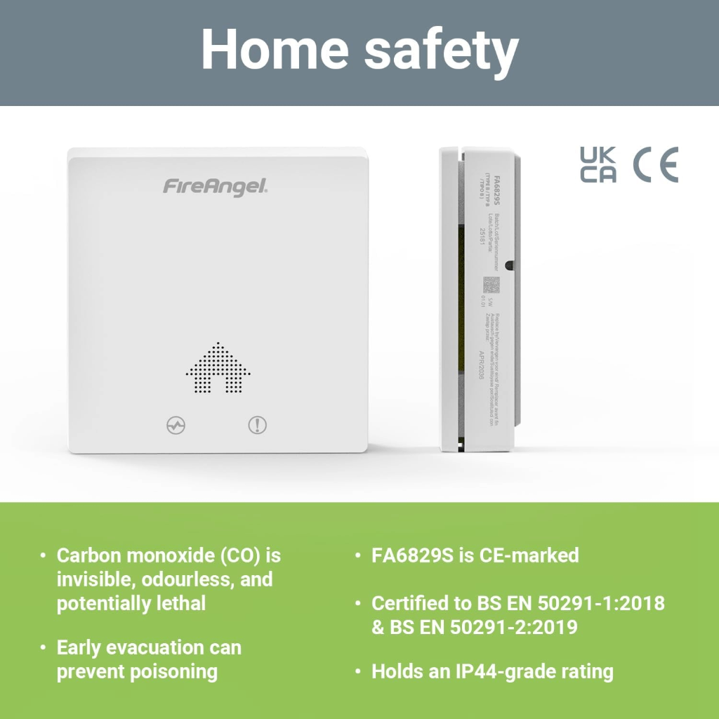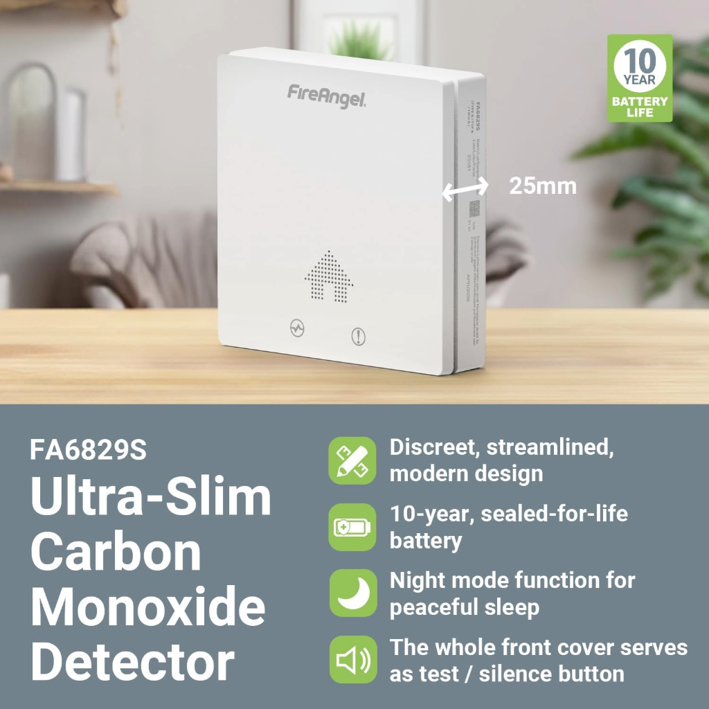 Anglies monoksido detektorius FireAngel FA6829S-EUX10 – itin plonas, kompaktiškas, su integruota baterija veikiantis, autonominis smalkių detektorius. Anglies monoksido detektorius FireAngel FA6829S-EUX10 greitai reaguoja į anglies monoksidą (CO), dažnai vadinamą „tyliuoju žudiku“, ir padeda užtikrinti jūsų ir jūsų šeimos saugumą.