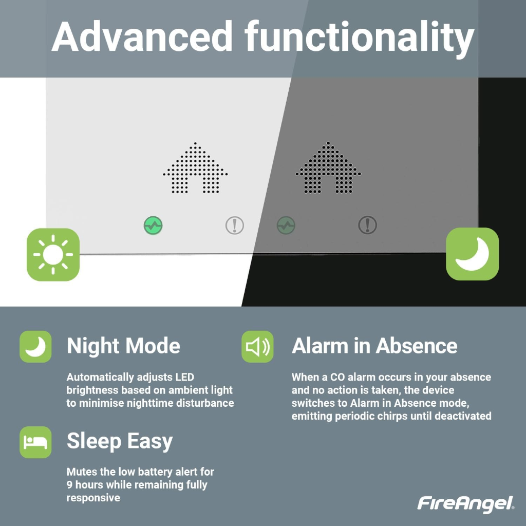 Aiškus skaitmeninis ekranas rodo „ALARM“, kai aptinkamas anglies monoksidas, suteikdamas greitą ir lengvai suprantamą įspėjimą. Detektorius sukurtas su pažangiu elektrocheminiu jutikliu ir IP44 apsauga nuo purslų, jis tinka namams, karavanams, kemperiams ir laivams. Tylioji testavimo funkcija leidžia patikrinti veikimą be garsių signalų, o naktinio jutimo funkcija sumažina LED ryškumą, kad galėtumėte ramiai miegoti naktį. Įmontuota atminties funkcija įrašo visus ankstesnius signalizacijos suveikimus, o „Sleep Easy“ funkcija iki 9 valandų nutildo baterijos išsikrovimo įspėjimus. Dėl itin plono, modernaus dizaino ir apsaugotos nuo sugadinimo baterijos šis CO detektorius užtikrina patikimą, diskretišką apsaugą.