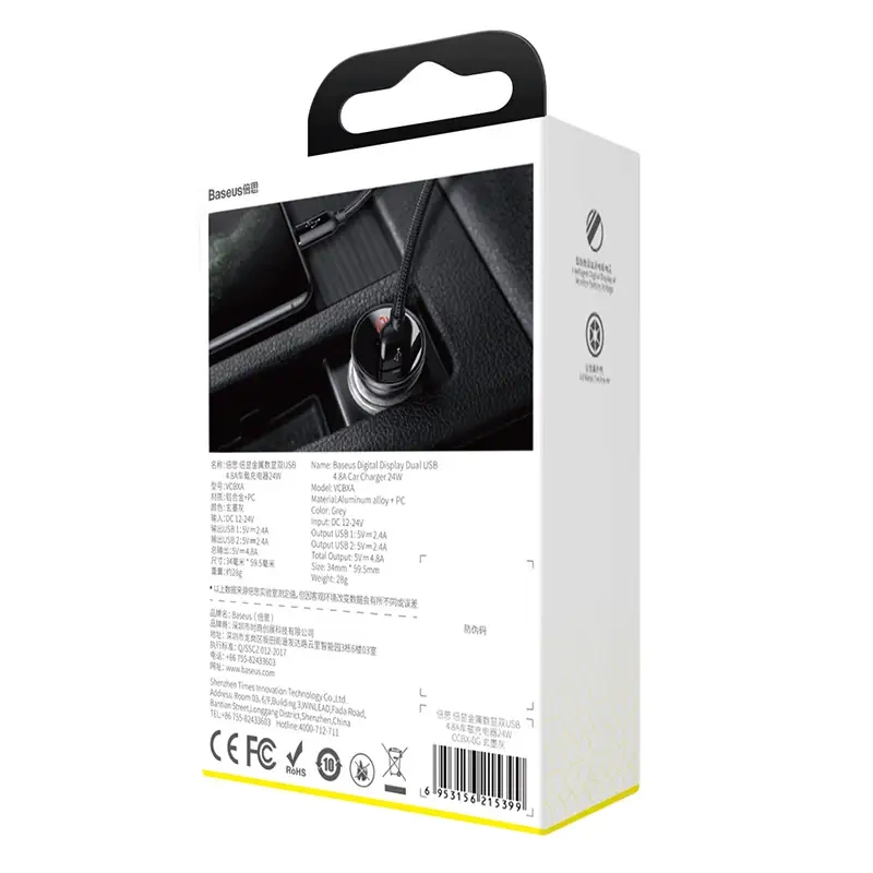Ładowarka samochodowa Baseus z wyświetlaczemAutomobilinis įkroviklis Baseus su ekranu, 2x USB, 4,8A, 24W (srebrna)