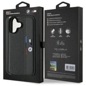 BMW M perforuotos trijų spalvų detalės linija iPhone 16 dėklas – tamsiai pilkas