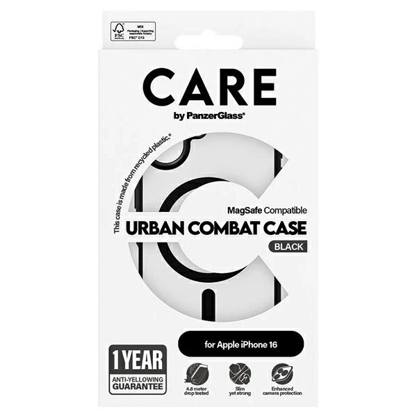 Etui PanzerGlass™ Urban Combat Case MagSafe z bestsellerowej serii COMBAT CASE to niezawodne połączenie wytrzymałości i nowoczesnej funkcjonalności. Wykonane w 100% z materiałów pochodzących z recyklingu, zapewnia niezrównaną ochronę urządzenia nawet przy upadkach z wysokości 4,8 metra, w tym na krawędzie. Specjalna powłoka zapobiega żółknięciu, co gwarantuje estetyczny wygląd etui przez długi czas użytkowania.