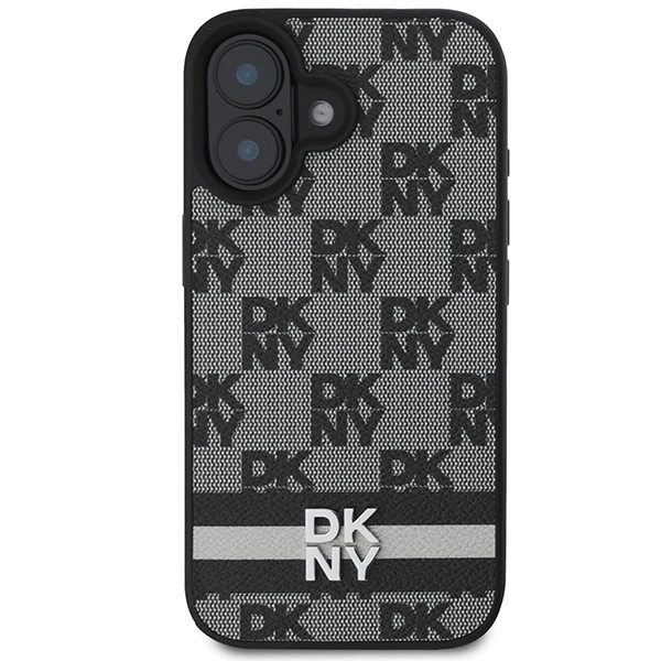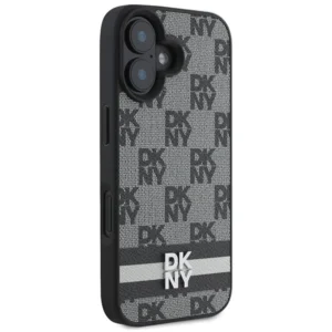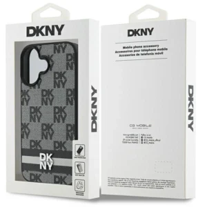 This DKNY case draws attention with its bold and elegant design. The back is covered with a pattern of the repeating "DKNY" logo, giving it a distinctive, luxurious look. At the bottom is a metallic silver DKNY logo, above which is a subtle horizontal stripe in shades of gray, adding a stylish accent. The black frame around the camera harmoniously matches the gray and black colors of the entire case, creating a coherent, modern look. This case not only looks great, but also provides solid protection for the phone.