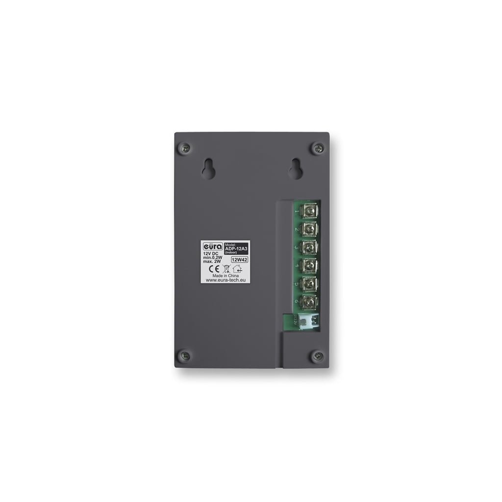 Domofonas Eura ADP-12A3 Invito turi grafito spalvos vidinį telefoną, nedidelio dydžio išorinį telefoną ir 12 V nuolatinės srovės maitinimo šaltinį.