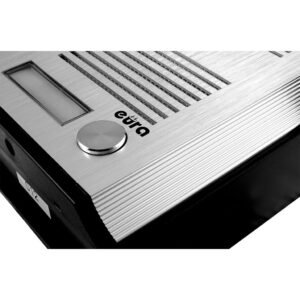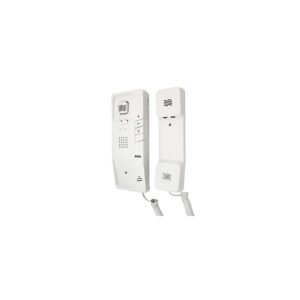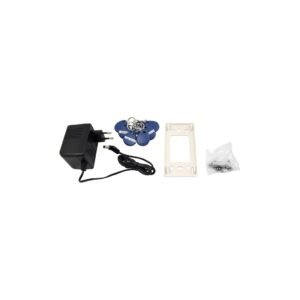 Domofonas Eura ADP-41A3 Remoto su raktų pakabuku – turi baltos spalvos unifoną, sidabrinę išorinę kasetę ir 12 V nuolatinės srovės maitinimo šaltinį.