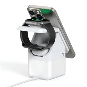 - Allows you to charge three devices simultaneously, eliminating the need for multiple chargers and cables. The station charges iPhone, Apple Watch and AirPods simultaneously. It can also be used as a phone stand and desk lamp.