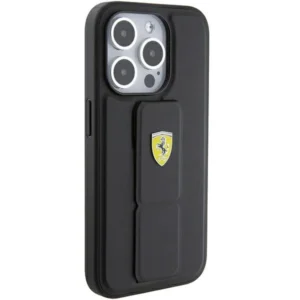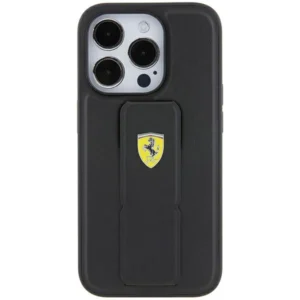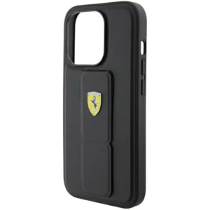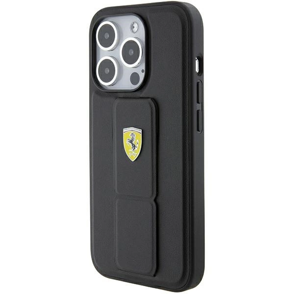 Ferrari Grip Stand Metal Logo dėklas iPhone 15 Pro – juodas