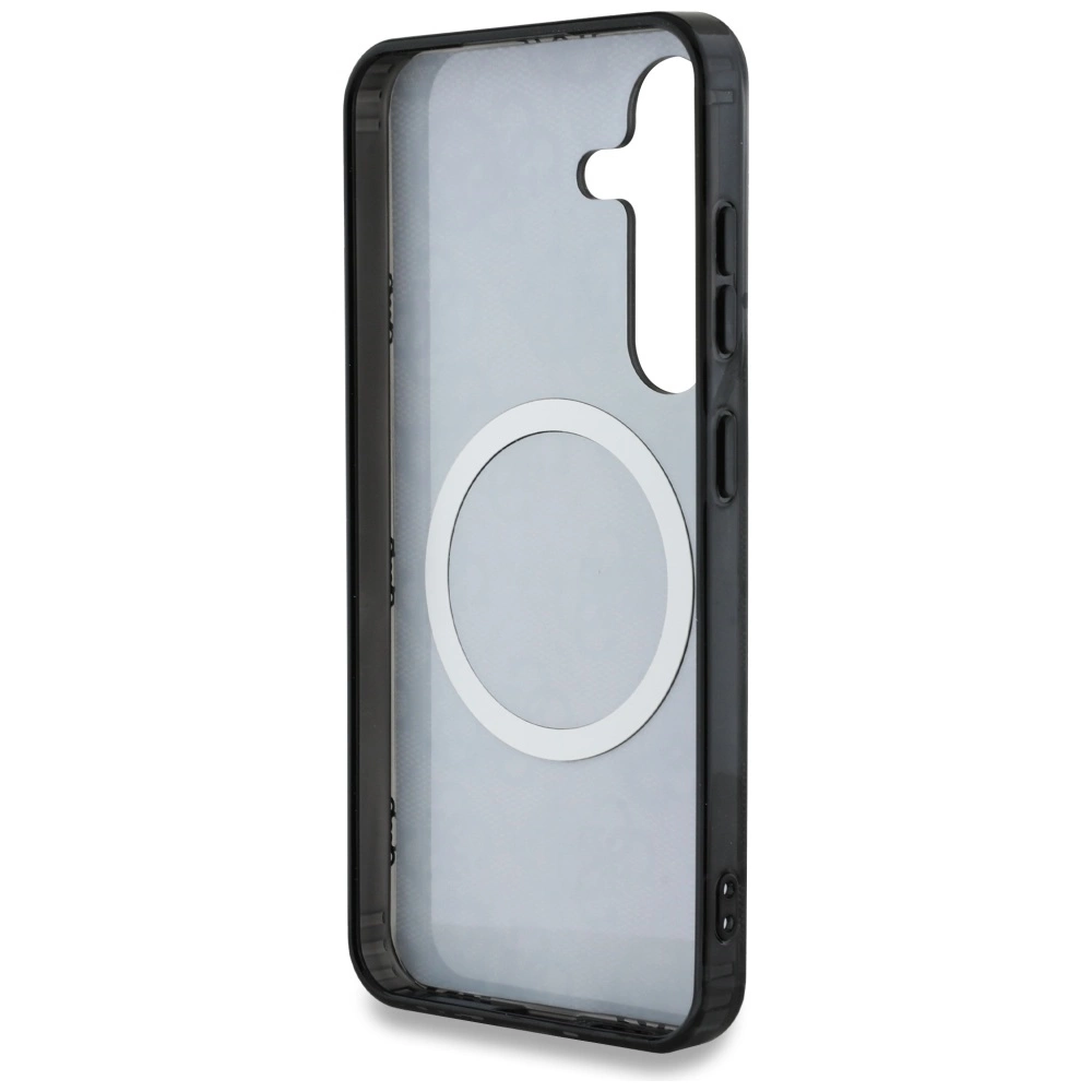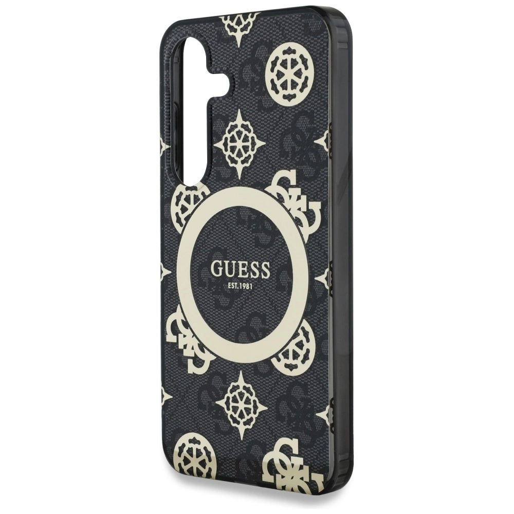Exclusive protective case from the renowned Guess brand is a combination of elegance and style at the highest level. The case is made of high-quality polycarbonate and polyurethane . The surface is decorated with a characteristic gold and black 4G pattern and a gold MagSafe ring.