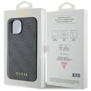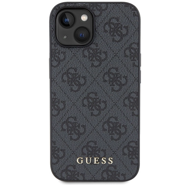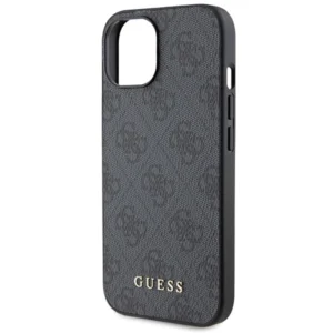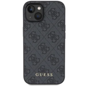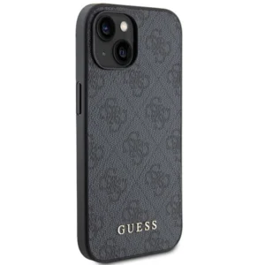 Guess 4G Metal Gold Logo iPhone 15 Case - GrayGuess 4G Metal Gold Logo iPhone 15 dėklas – pilkas