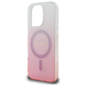 To stylowe etui wyróżnia się subtelnym efektem gradientu i brokatową powierzchnią, która nadaje mu niepowtarzalny wygląd i elegancję. Pierścień MagSafe został estetycznie zintegrowany z projektem, dzięki czemu jest nie tylko funkcjonalny, ale także idealnie współgra z całością. Natomiast w centralnej części etui znajduje się delikatne złote logo Guess, które dodaje mu klasycznego uroku.
