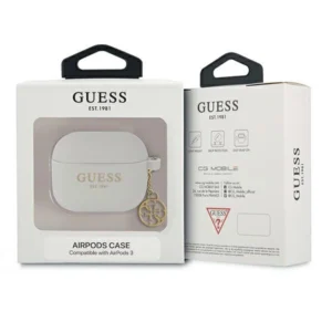 Guess Silicone Charm Cover. The silicone case protects the Apple AirPods wireless headphones dock from surface damage and possible loss. The high-quality silicone case fits perfectly with the original AirPods case and is extremely pleasant to the touch. The case is distinguished by the gold Guess logo, additionally on the side there is a gold 4G pendant that makes the case look elegant.