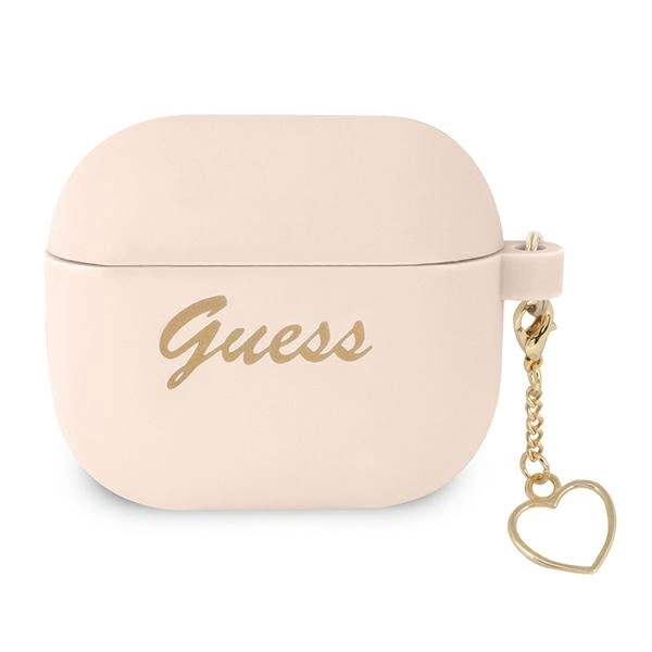 Guess Silicone Charm Cover. The silicone case protects the Apple AirPods wireless headphone dock from surface damage and possible loss. The high-quality silicone case fits perfectly with the original AirPods case and is extremely pleasant to the touch. The case is distinguished by the gold Guess logo in Vintage style, additionally on the side there is a gold pendant that makes the case look elegant.