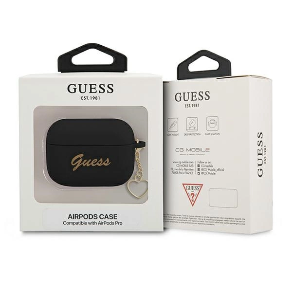 Guess Silicone Charm Cover. The silicone case protects the Apple AirPods wireless headphones dock from surface damage and possible loss. The high-quality silicone case fits perfectly with the original AirPods case and is extremely pleasant to the touch. The case is distinguished by the gold Guess logo in Vintage style, additionally on the side there is a gold pendant that makes the case look elegant.
