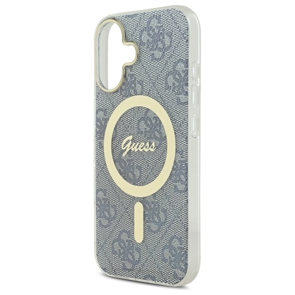 Etui wyróżnia się wyjątkową elegancją, której kwintesencją są dopracowane detale, takie jak złota ramka wokół aparatu oraz stylowy złoty pierścień MagSafe. Wysokiej jakości print 4G, będący ikoną stylu Guess, nadaje pokrowcowi klasyczny, ponadczasowy wygląd. Wewnątrz magnetycznego pierścienia subtelnie wkomponowano także logo Guess, perfekcyjnie współgrające z kolorystyką pokrowca, tworząc harmonijną i spójną całość.