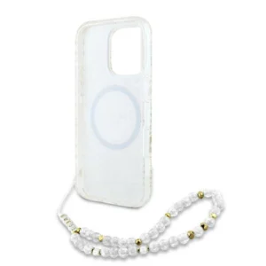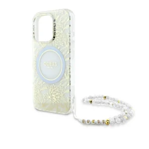 Ta elegancka kolekcja zachwyci nawet najbardziej wybredne i wyrafinowane gusta. Wierzchnia warstwa pokrowca zachwyca subtelnym, złotym, roślinnym wzorem, który nadaje mu elegancji i klasy. Centralnym punktem etui jest złoty pierścień MagSafe, otaczający stylowe logo GUESS, które dodaje prestiżu i podkreśla wyjątkowy design. Całość uzupełnia gustowny koralikowy brelok, doskonale współgrający z kolorystyką pokrowca, z literkami tworzącymi nazwę „GUESS”, co sprawia, że akcesorium to jest nie tylko praktyczne, ale i wyjątkowo modne.