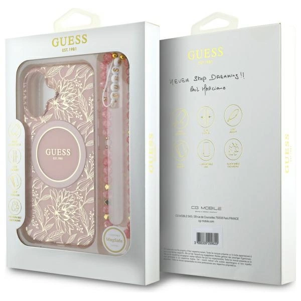 Ta elegancka kolekcja zachwyci nawet najbardziej wybredne i wyrafinowane gusta. Wierzchnia warstwa pokrowca zachwyca subtelnym, złotym, roślinnym wzorem, który nadaje mu elegancji i klasy. Centralnym punktem etui jest złoty pierścień MagSafe, otaczający stylowe logo GUESS, które dodaje prestiżu i podkreśla wyjątkowy design. Całość uzupełnia gustowny koralikowy brelok, doskonale współgrający z kolorystyką pokrowca, z literkami tworzącymi nazwę „GUESS”, co sprawia, że akcesorium to jest nie tylko praktyczne, ale i wyjątkowo modne.