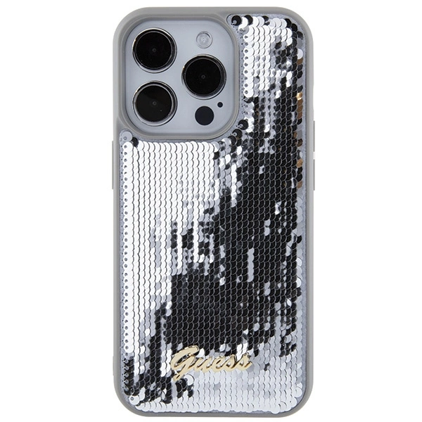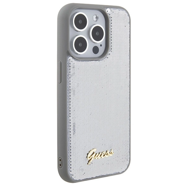 Guess Sequin Script Metal case for iPhone 15 Pro Max - silverGuess Sequin Script Metal dėklas iPhone 15 Pro Max – sidabrinis