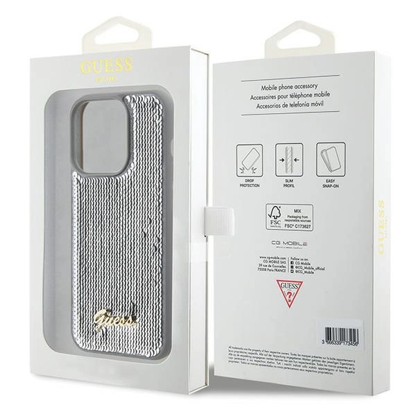 Pradinis | Parduotuvė | Telefonų priedai | Dėklai | Išmaniųjų telefonų apsauginiai dėklai | Guess Sequin Script Metal dėklas iPhone 15 Pro Max – sidabrinis