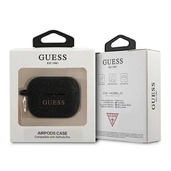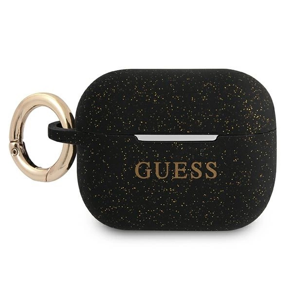 Guess Silicone Cover. The silicone case protects the docking station of the Apple AirPods Pro wireless headphones from surface damage and scratches. The high-quality silicone case fits perfectly into the original AirPods Pro case and is extremely pleasant to the touch. On the side of the case there is a practical, gold ring that allows you to attach the case to a lanyard, for example. The glitter finish adds additional visual effects.