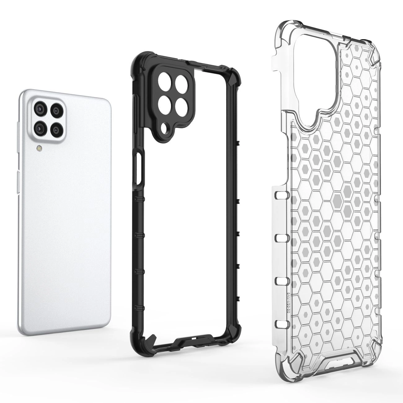 - Hybrid case with a rigid back and a flexible frame.