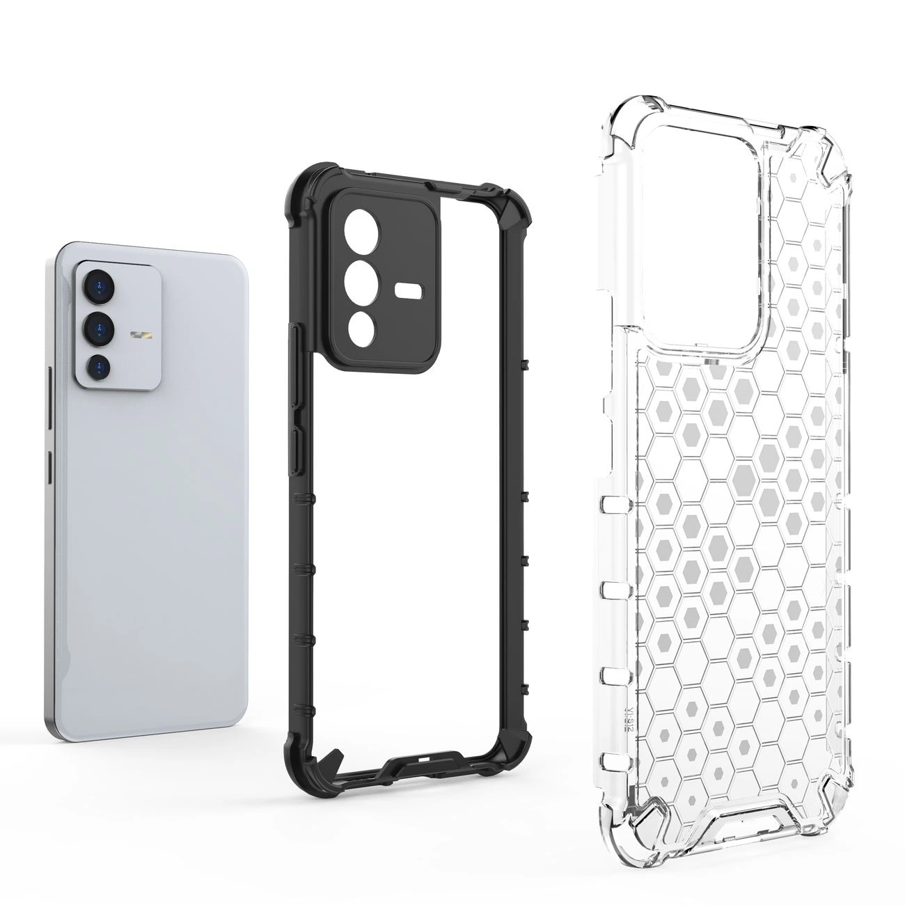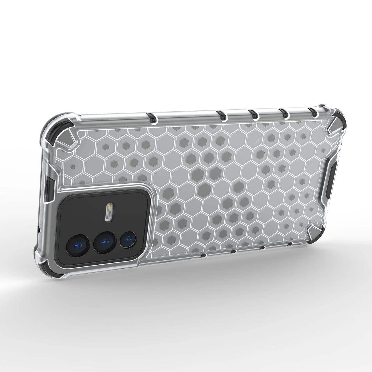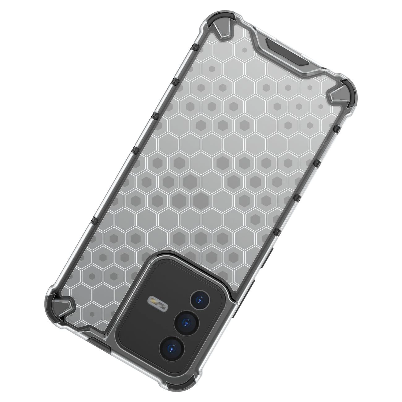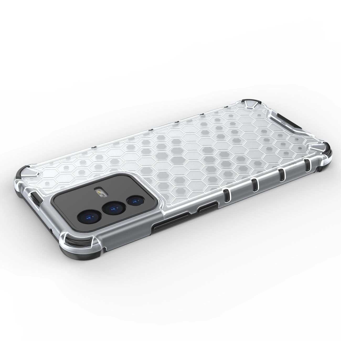 - Hybrid case with a rigid back and a flexible frame.