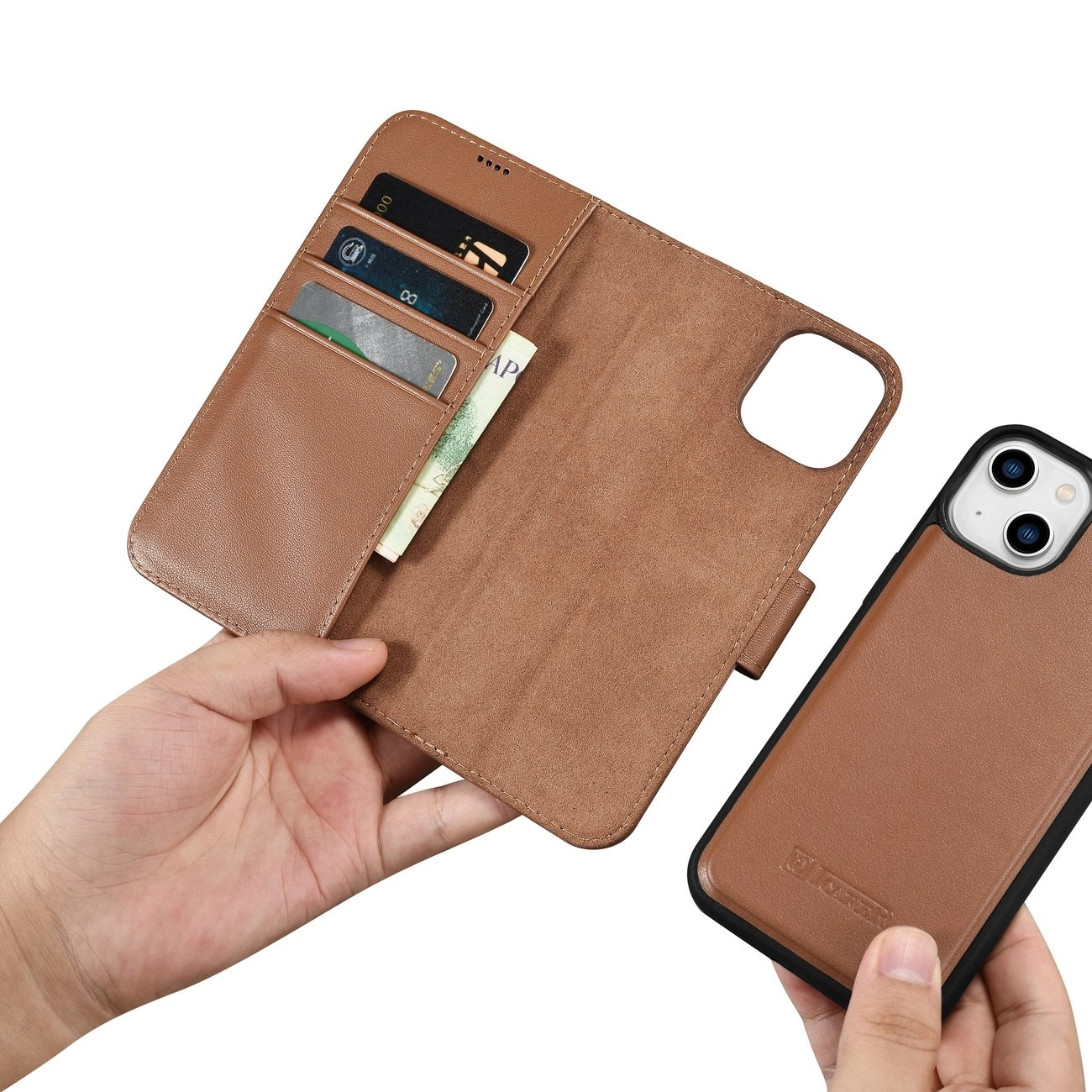 iCarer piniginės tipo dėklas 2in1 iPhone 14, odinis flip dėklas, Anti-RFID, rudas (WMI14220725-BN)