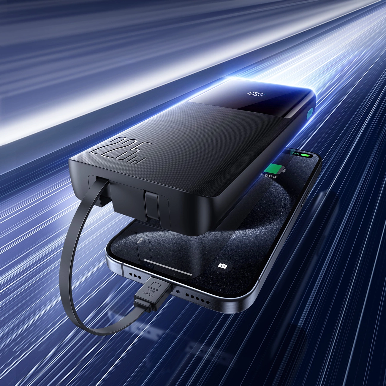 Two built-in cables eliminate the need to carry additional cables. Compatibility with Apple and Android devices makes the power bank ready for use in any situation.