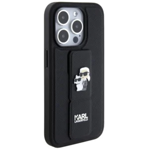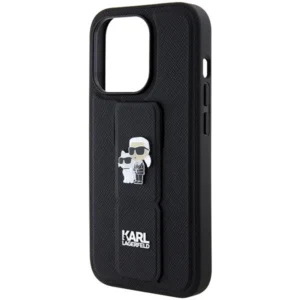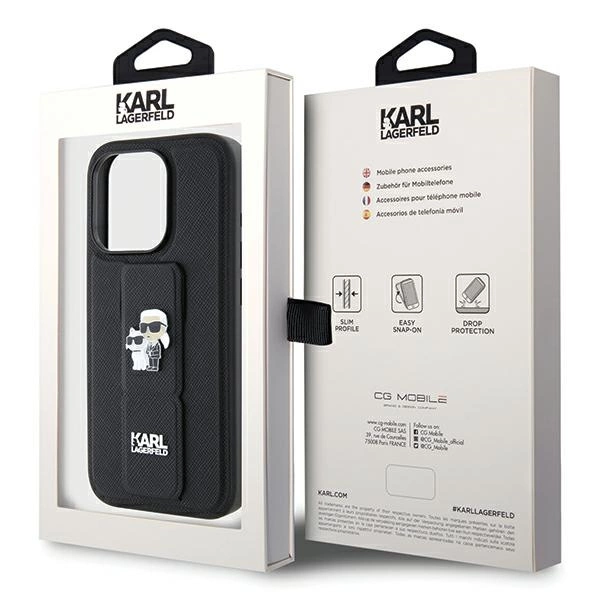 Karl Lagerfeld Gripstand Saffiano Karl & Choupette Pins dėklas iPhone 14 Pro – juodas