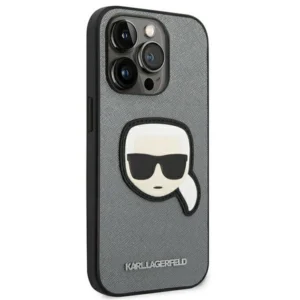 Karl Lagerfeld KLHCP14LSAPKHG iPhone 14 Pro 6,1″ sidabrinis kietas dėklas Saffiano Karl galvos emblema