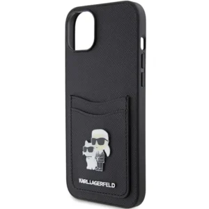 Pradinis | Parduotuvė | Telefonų priedai | Dėklai | Išmaniųjų telefonų apsauginiai dėklai | Karl Lagerfeld Saffiano kortelių lizdas Karl & Choupette metalinis smeigtukas dėklas skirtas iPhone 15 – juodas