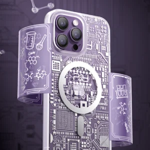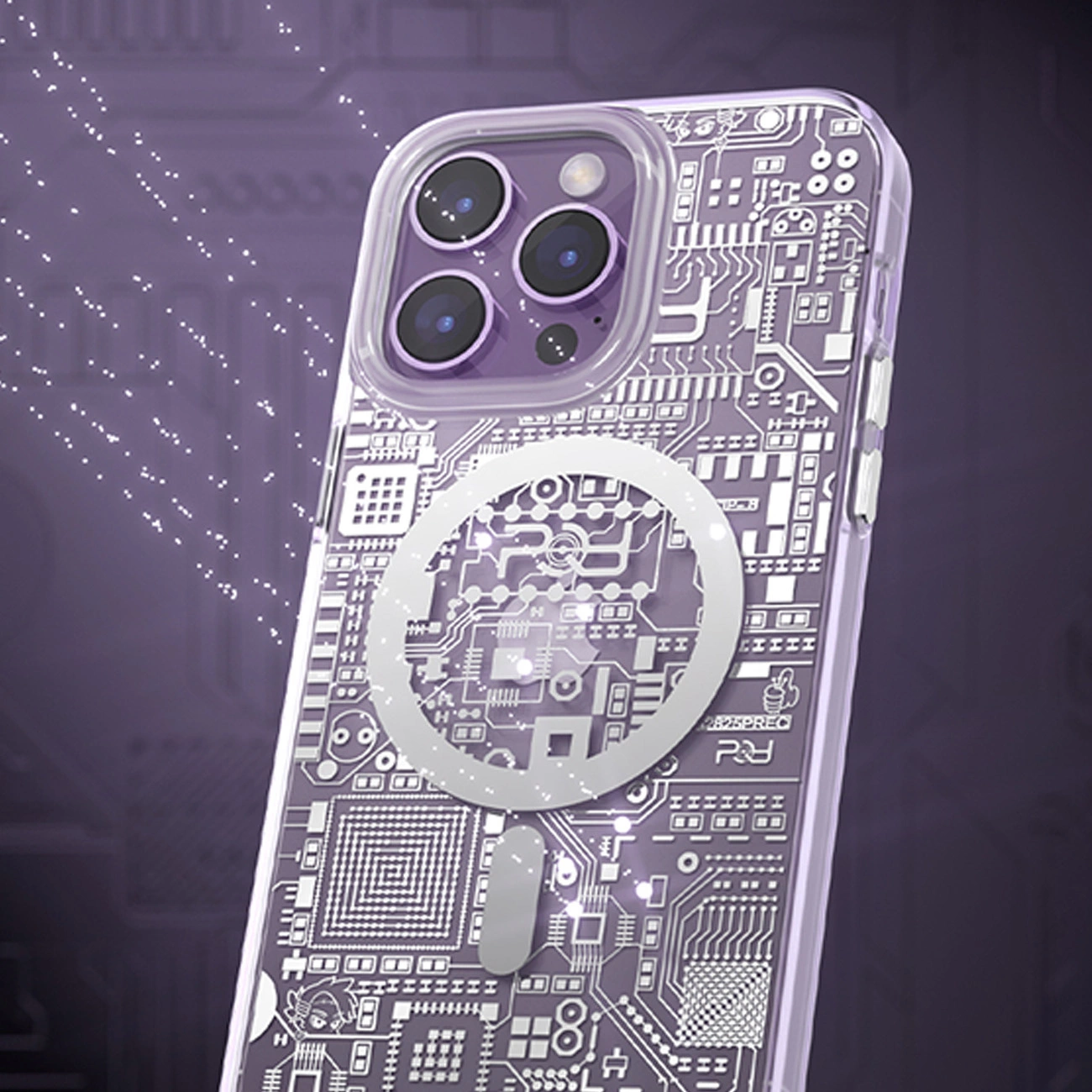 Something for a real geek! This transparent smartphone case is inspired by the texture of a printed circuit board. Made of solid plastic, effectively protects the device against the effects of falls. Supports MagSafe technology, making wireless charging possible. Metal buttons in a contrasting color make this case look very modern. The cover is adapted to the iPhone 14 Pro , perfectly protects the phone against damage due to falls or scratches (for example, by keys carried in a pocket). Raised edges around the screen and rear camera protect the phone from scratching these elements when it is placed on a flat surface. It has responsive buttons and cutouts for ports. Perfect for people who value style, quality and want to take care of their device.