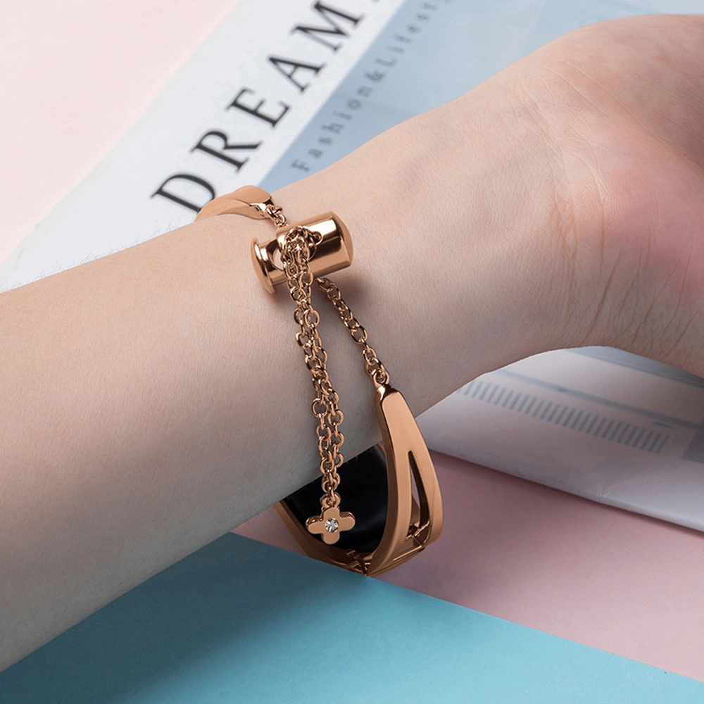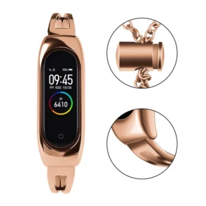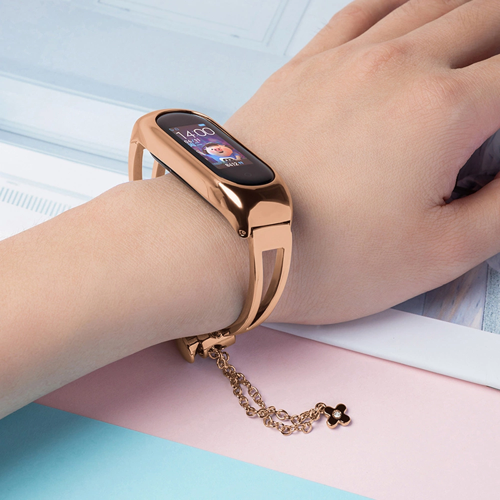 Elegant watchband for the Xiaomi Mi Band 3/4/5/6, in a beautiful color. Made of smooth stainless steel, the accessory has an ergonomic shape that adapts to the shape of the wrist. The headband is fastened with a clip with a decorative chain, finished with a zircon.