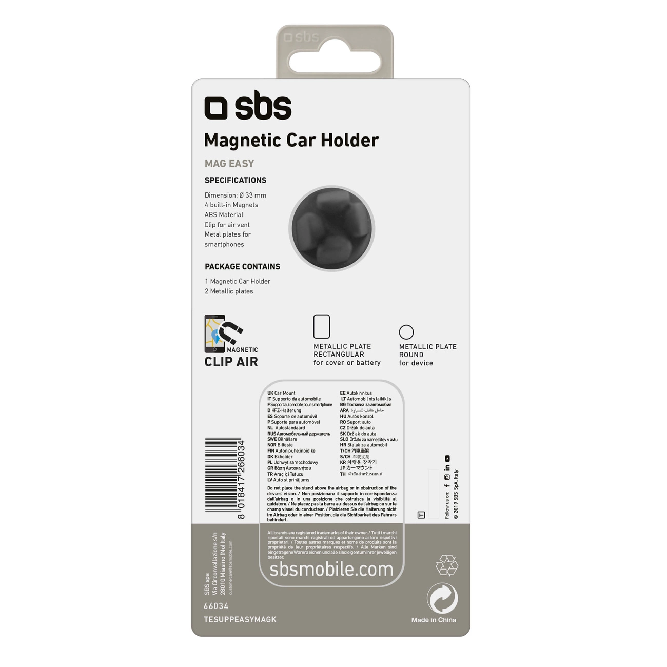 SBS TESUPPEASYMAGK is a modern car holder for a smartphone that combines style, comfort and safety. Ideal for people who often use navigation or have to answer calls while driving. Thanks to the advanced mounting system on four magnets, the holder ensures a stable and reliable hold of the phone. The practical clip allows for quick and secure attachment to the air vent, which guarantees excellent screen visibility. The set includes two metal plates (round and rectangular), which allow you to adjust the holder to any smartphone. The lightweight, compact design and ease of installation make it a perfect solution for every driver. Choose comfort and safety – choose SBS TESUPPEASYMAGK!