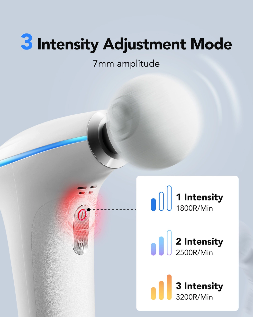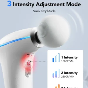 - It allows you to choose the level of massage intensity while maintaining silence and comfort during use. It has a powerful but quiet motor with adjustable intensity (1800 to 3200 rpm).