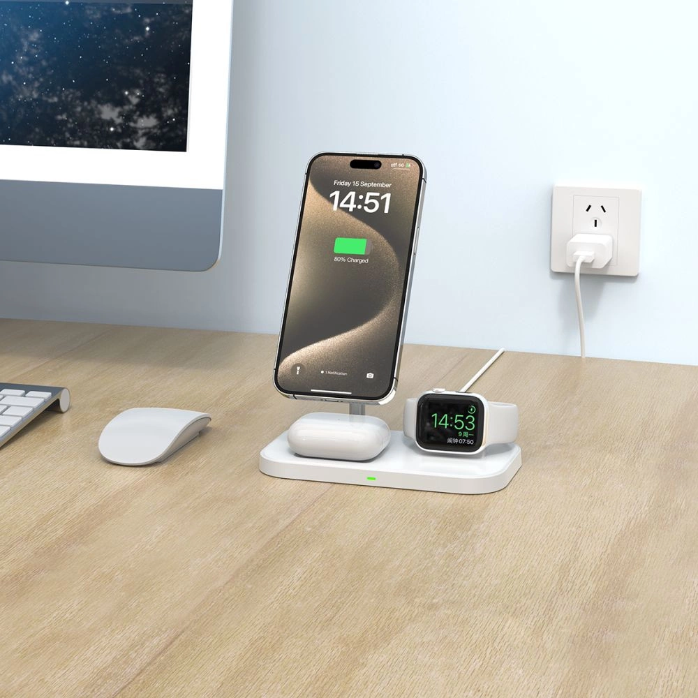 Tech-Protect QI15W-A22 MagSafe inductive charger with 3in1 MagSafe stand for smartphone / Apple Watch / AirPods - whiteTech-Protect QI15W-A22 MagSafe indukcinis įkroviklis su 3in1 MagSafe stovu telefonui / Apple Watch / AirPods – baltas