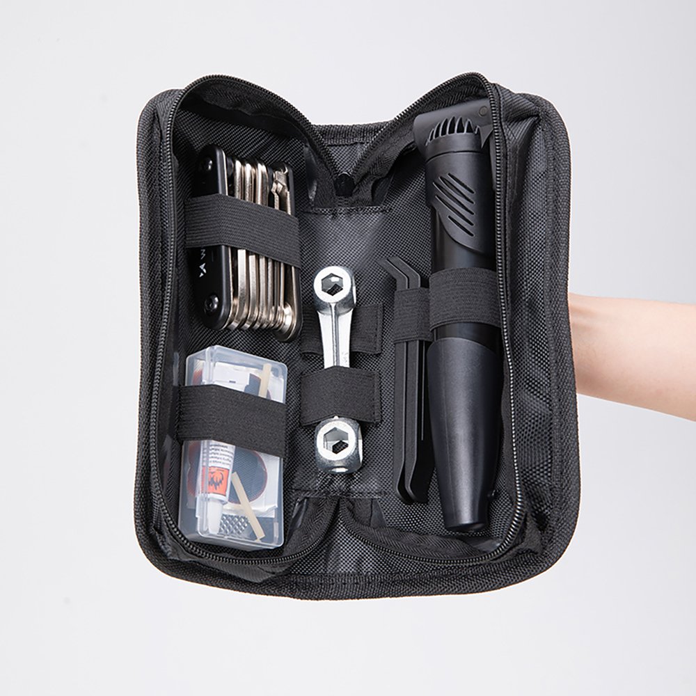 Wozinsky WMZ-01N tool kit, 16-in-1 bicycle multitool, pump, wrenches, inner tube kit – black