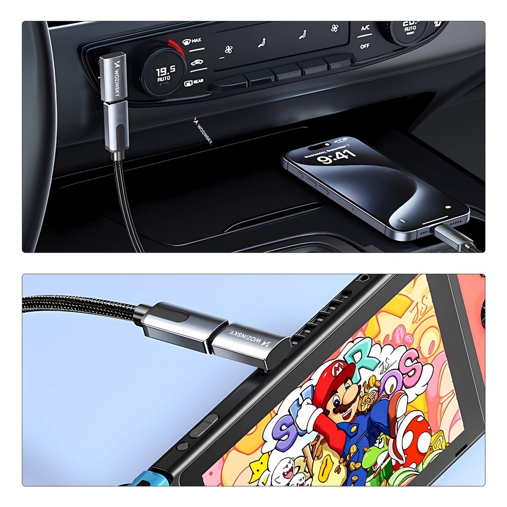 The Wozinsky WPKF-01 Angled Adapter is an accessory designed for convenience, durability, and maximum performance. Its angled design protects device ports and cables from excessive wear and tear while providing easy access in tight spaces. It supports 40 Gbps data transfer, PD3.1 fast charging up to 240W, and 8K video at 60Hz. It's a versatile solution for work, entertainment, and everyday use, whether you're connecting a laptop, console, phone, or tablet.