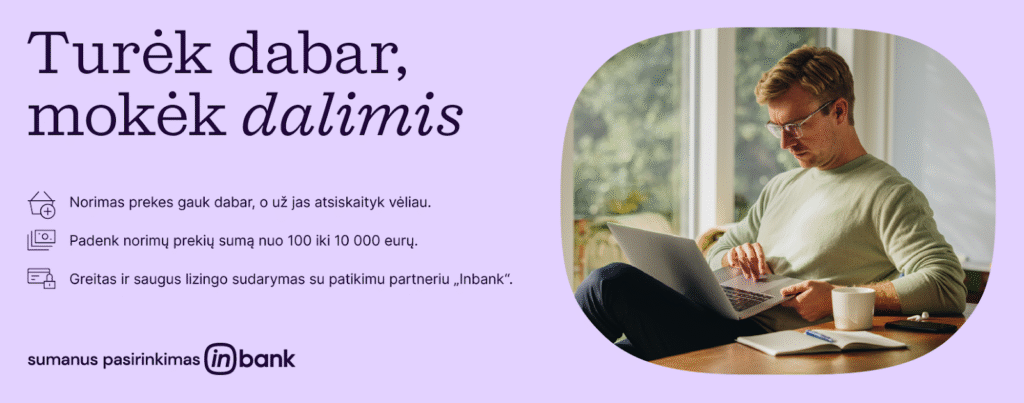 Neatidėliokite pirkimo, iš karto įsigykite prekes lizingu ir mokėkite dalimis vėliau! Bendradarbiaudami su „Inbank“ siūlome puikią galimybę dideles, vienkartines išlaidas paversti nedidelėmis mėnesinėmis išlaidomis.